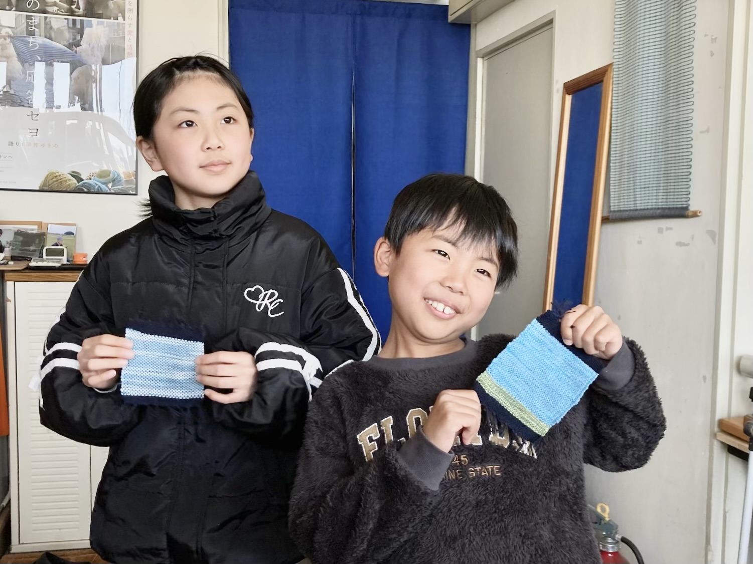 姉弟で楽しくコースターを織り上げてハイチーズ!