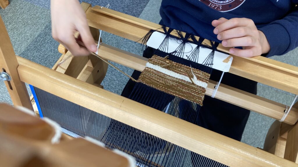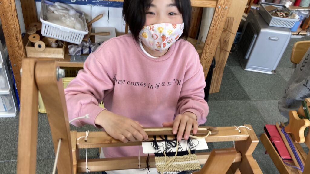 それぞれヨコ糸に好きな色を選んで早速織り始めます。