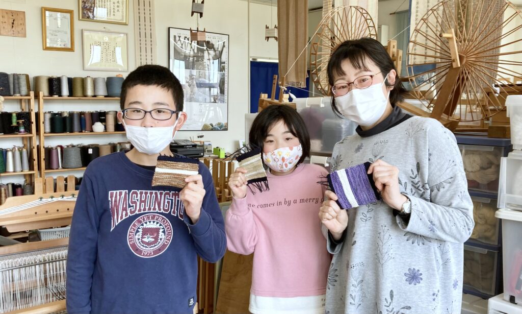 春本番のいい天気が続くなか、親子三人でコースターの手織り体験に来てくださいました。