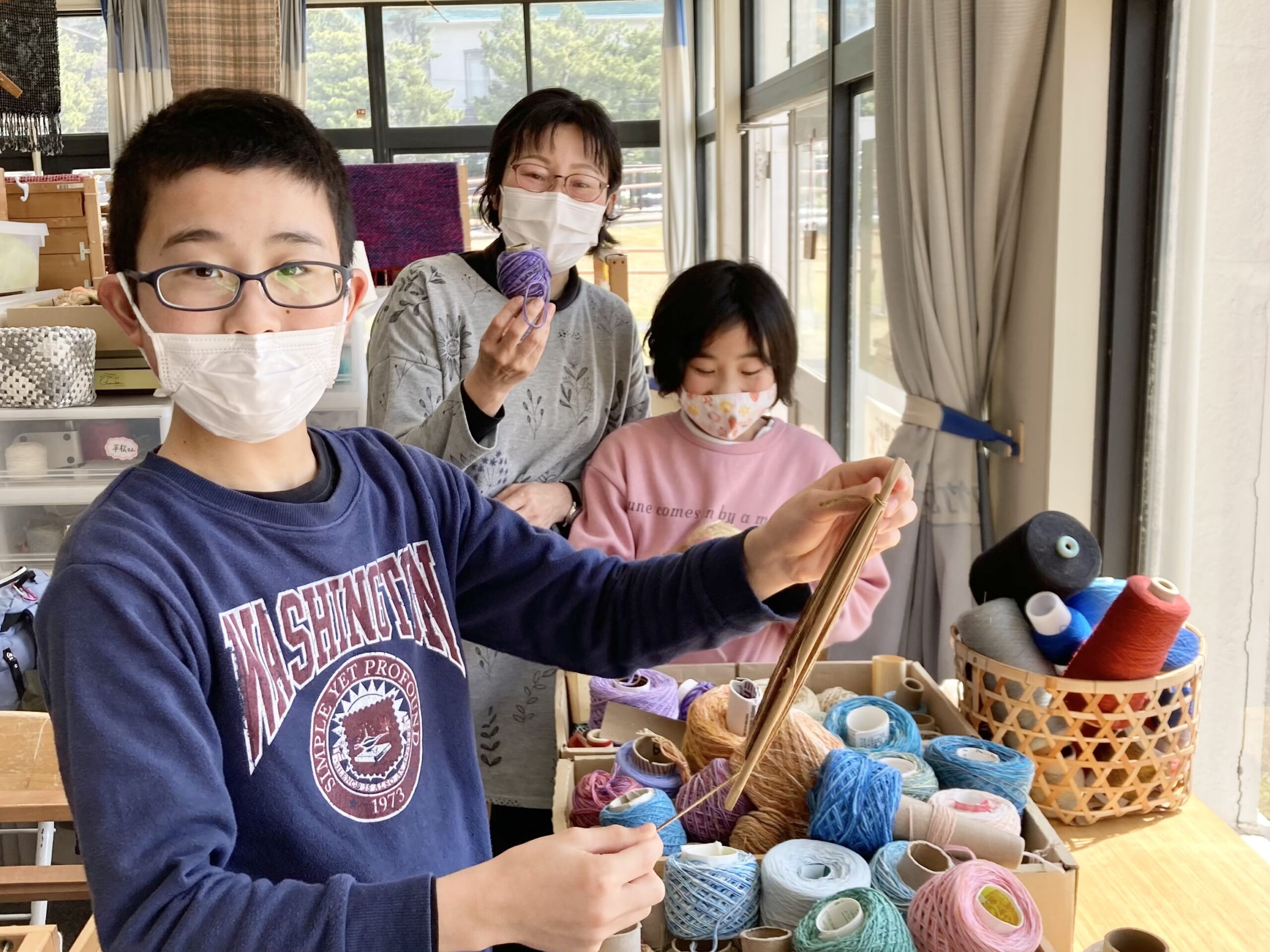 今日のTCC春本番のいい天気が続くなか、親子三人でコースターの手織り体験に来てくださいました。